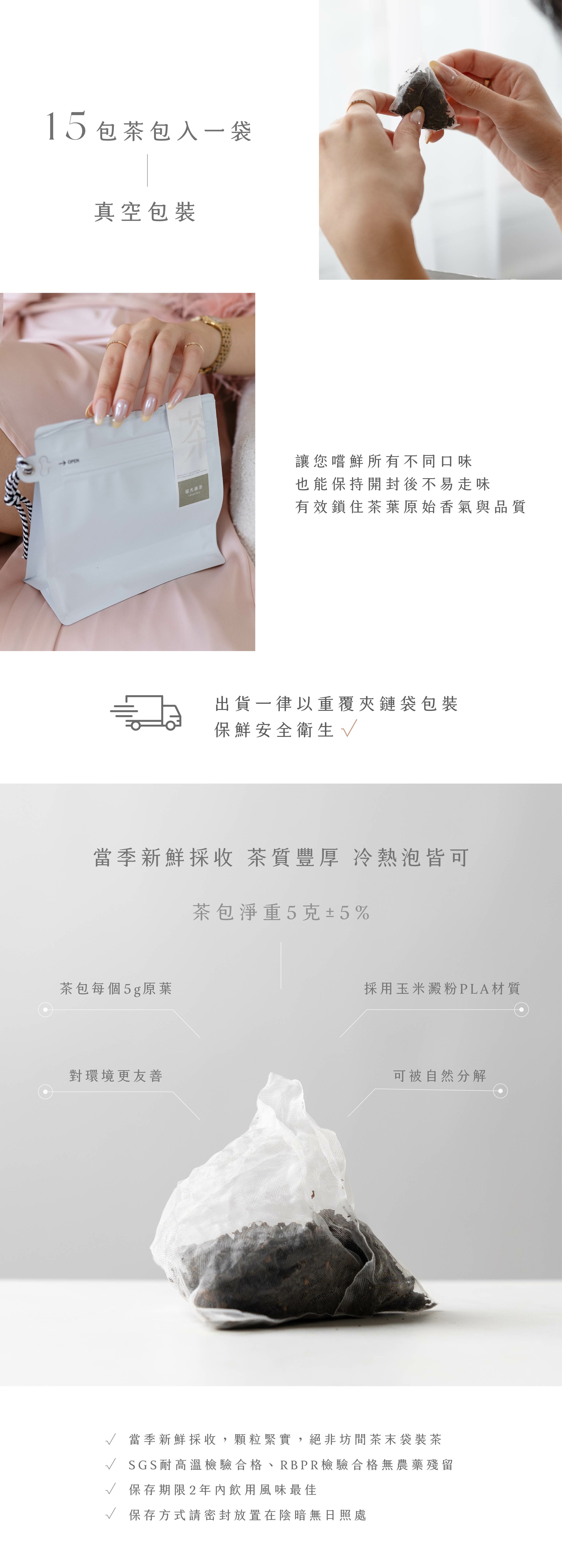 茶包每個5g原葉,採用玉米澱粉PLA材質,可被自然分解,對環境更友善